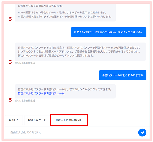 AIが有人によるサポートが必要だと判断した場合は、「メール」「電話」でのお問い合わせをご提案します。 チャット内下の「サポートに問い合わせ」をクリックして、表示されたURLへお進みください。