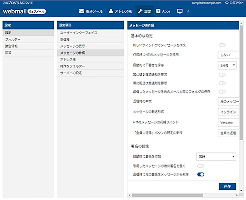 設定画面では、WEBメールの各種設定を編集することが可能です。