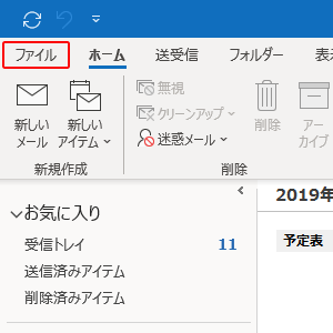 Outlookを立ち上げ、「ファイル」をクリックします。