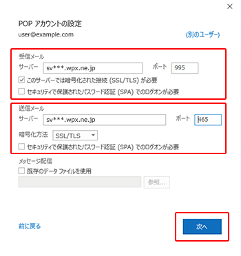 アカウントの設定情報を入力します。入力後は「次へ」をクリックします。