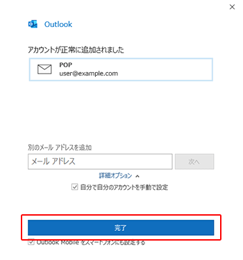 「アカウントが正常に追加されました」と出たら、「完了」を押して画面を閉じ、続けてSMTP認証設定を行ってください。