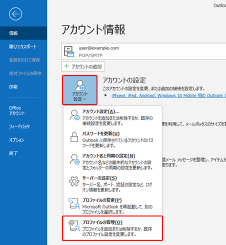 「アカウント設定」のメニュー内にある、「プロファイルの管理(O)」をクリックします。