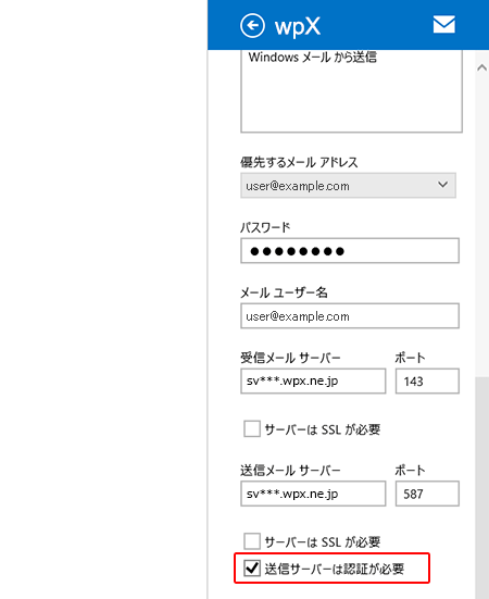 | メールの送信と受信で同じユーザー名とパスワードを使う | チェックを【入れる】 |