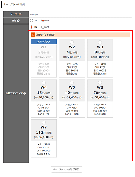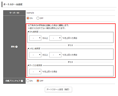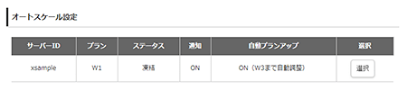 | 自動プランアップ | オートスケール設定による自動プランアップの上限を設定することができます。 |