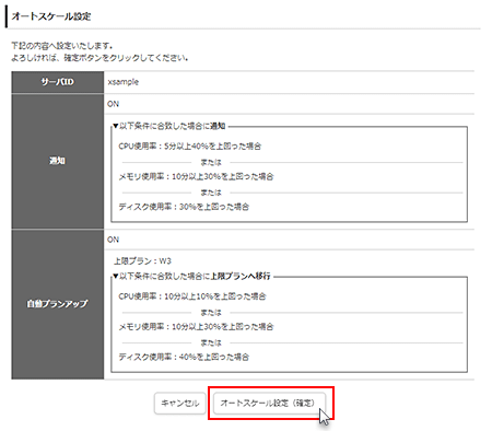 設定内容をご確認の上、「オートスケール設定(確定)」ボタンをクリックしてください。