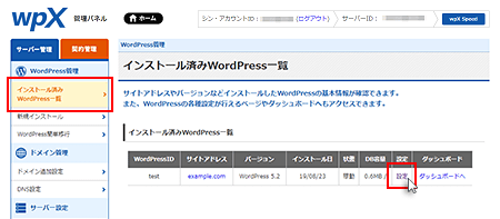管理パネルへログイン後、「WordPress管理」カテゴリの「インストール済みWordPress一覧」メニューをクリックし、対象WordPressの「設定」をクリックしてください。