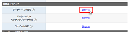 WordPress設定画面のページ下部にある「自動バックアップ」内から、「データベースの復元」の「設定する」をクリックします。