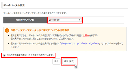 「対象バックアップ日」を選択して、注意事項もお読みいただいた上で「復元(確認)」ボタンをクリックしてください。